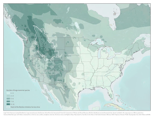 Figure 1 (above): Large mammal species range overlap in North America, with the Heart of the Rockies service area boundary in white.