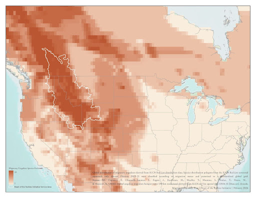 Figure 2, a (below): Species distribution of migratory ungulates derived from IUCN Red List data, showing the global significance of the Rocky Mountain West of North America.