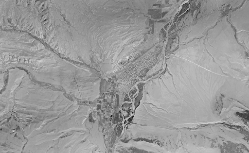 The images below are of the town of Livingston, Montana: 1948 in black and white, and 2023 in color.